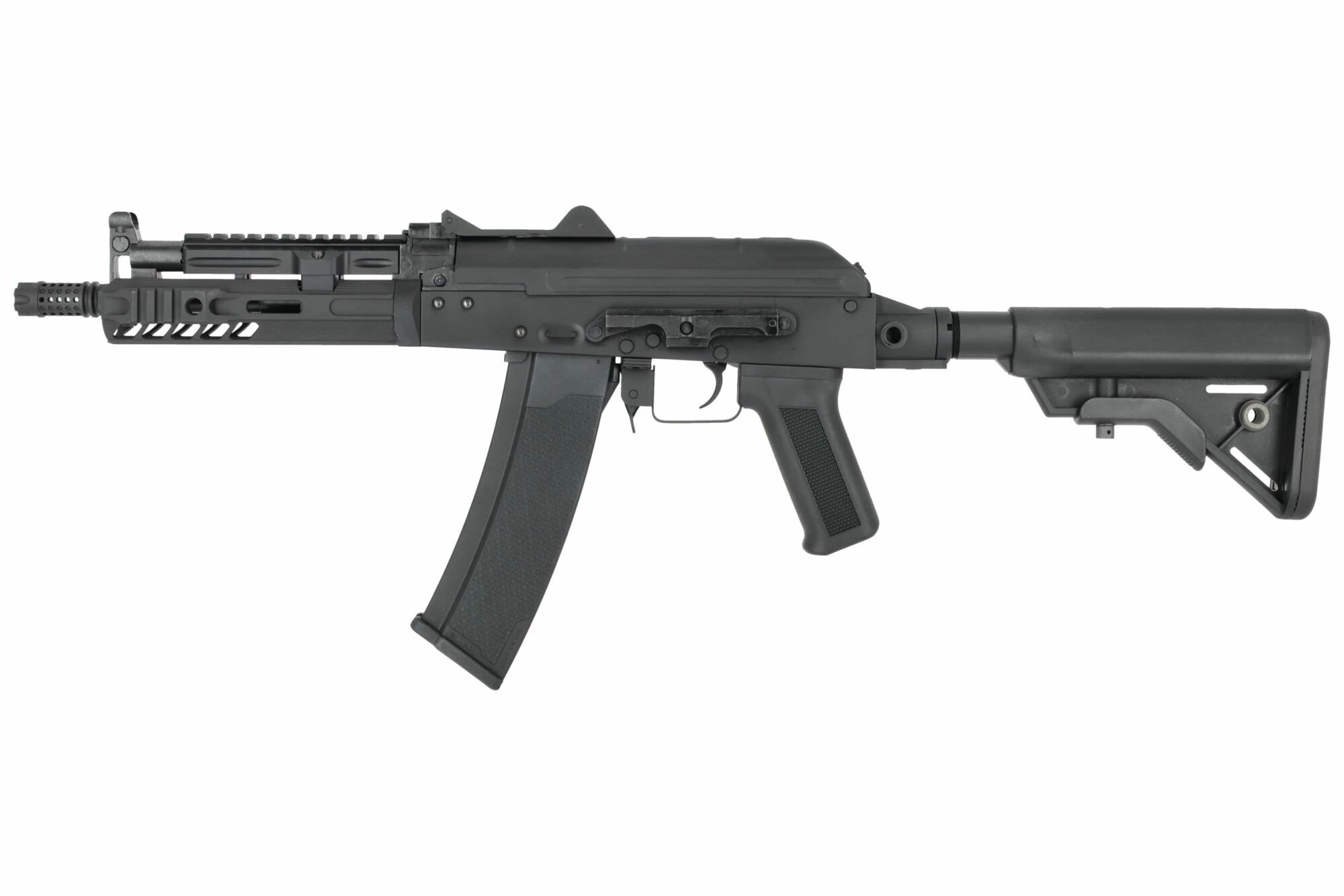 Sur l’externe, la SA-PJ24 adopte une conception solide avec receivers métal et une structure full métal. Parmi les composants acier mentionnés figurent notamment le canon, le dust cover de la chambre, le canon externe, le pontet, le bouton de chargeur, le sélecteur, le point d’attache QD sur la crosse et le tube de gaz. L’aluminium est utilisé sur des éléments clés comme les organes de visée, le dispositif de bouche, le support latéral dovetail, la pièce mobile avec levier d’armement, les guides de crosse, et surtout le garde-main avec sur-couche de tube de gaz. Cette configuration a été pensée pour faciliter l’accessoirisation grâce à la présence de rails Picatinny supérieurs et latéraux complétant les fixations M-LOK latérales et inférieure. Le pistol grip, la crosse tactique rétractable et les chargeurs mid-cap sont en polymère, afin de conserver une prise en main efficace et de limiter le poids sur les éléments manipulés.